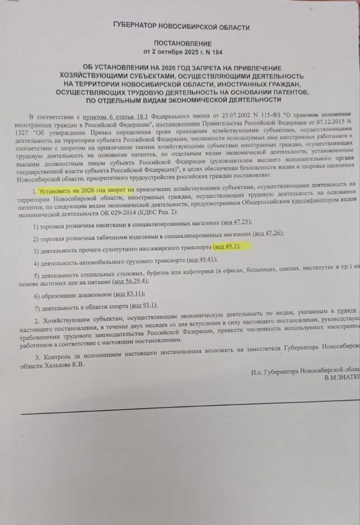 Андрей Травников, раиси вилояти Новосибирский бо имзои ин фармон кор кардани муҳоҷирони хориҷиеро, ки шаҳрвандӣ надоранд ва бо иҷозатномаи корӣ (патент) кор мекунанд, дар чанд самт мамнуъ кардааст.